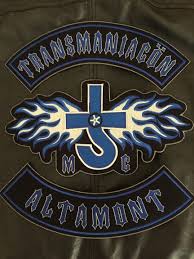 " 'With Satan's hog no pig at all, and the weather getting dry, We're heading south from Altamont in a cold-blooded travelled trance, So clear the road my bully boys and let some thunder pass, We're pain, we're steel, a plot of knives, We're Transmaniacon MC.'